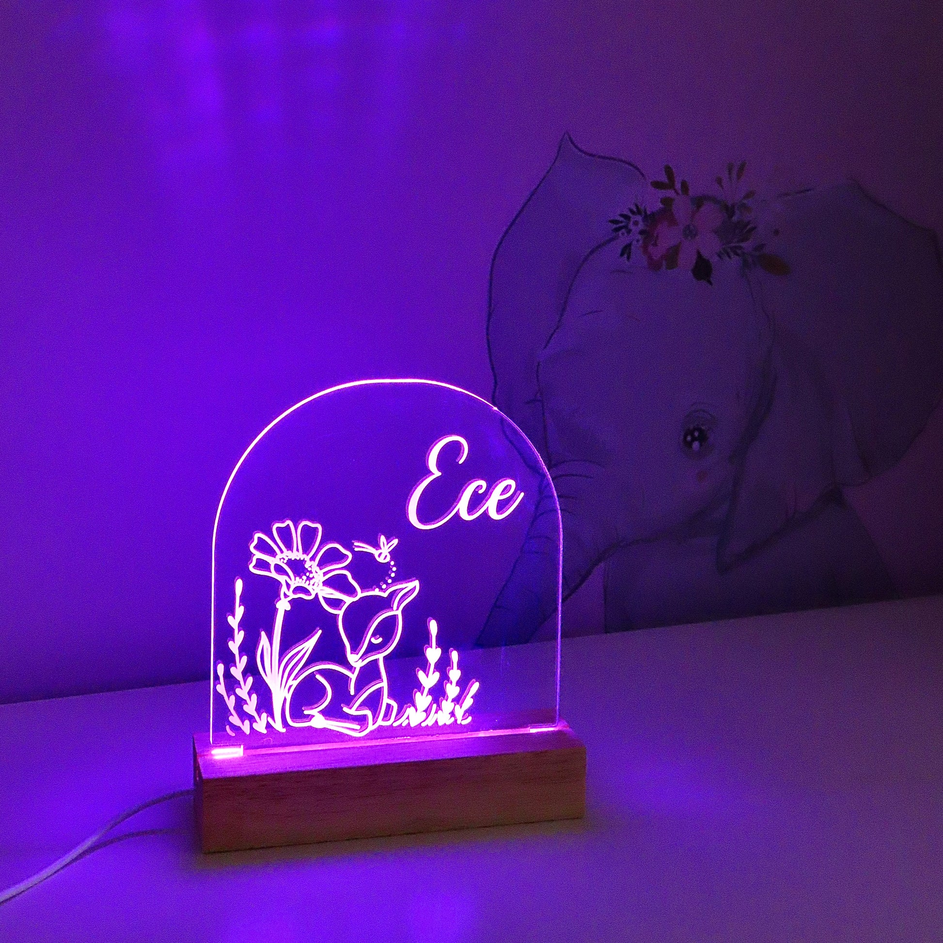 Dieses personalisierte LED-Nachtlicht zaubert eine warme Atmosphäre ins Kinderzimmer! Der stabile Holzsockel sorgt für natürlichen Charme, und auf dem gravierten Acrylglas leuchten der Name deines Kindes zusammen mit zauberhaften Motiven wie Blumen oder einem Reh. Du kannst aus verschiedenen Farben für das Licht wählen – perfekt, um eine liebevolle Schlafumgebung zu schaffen.